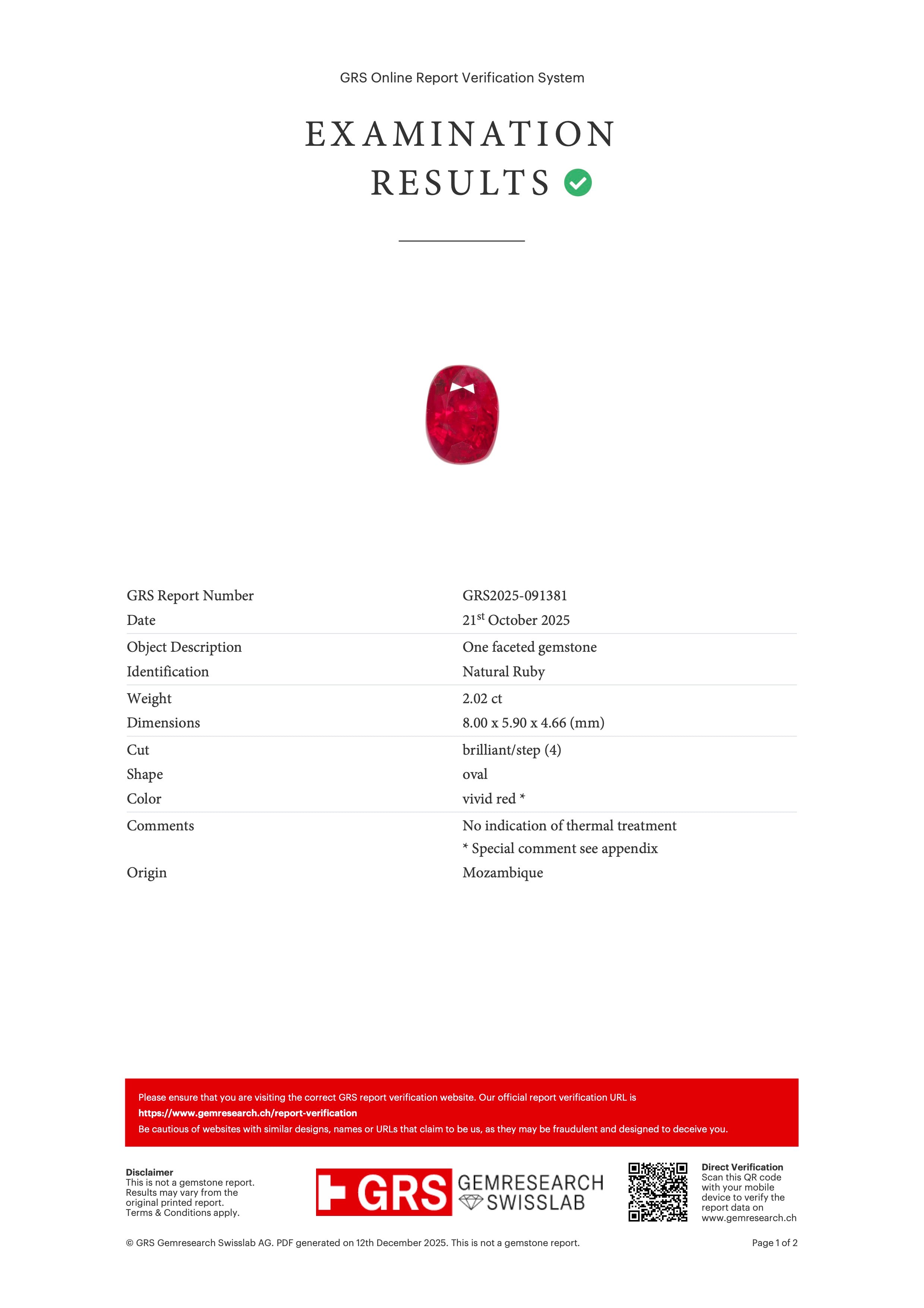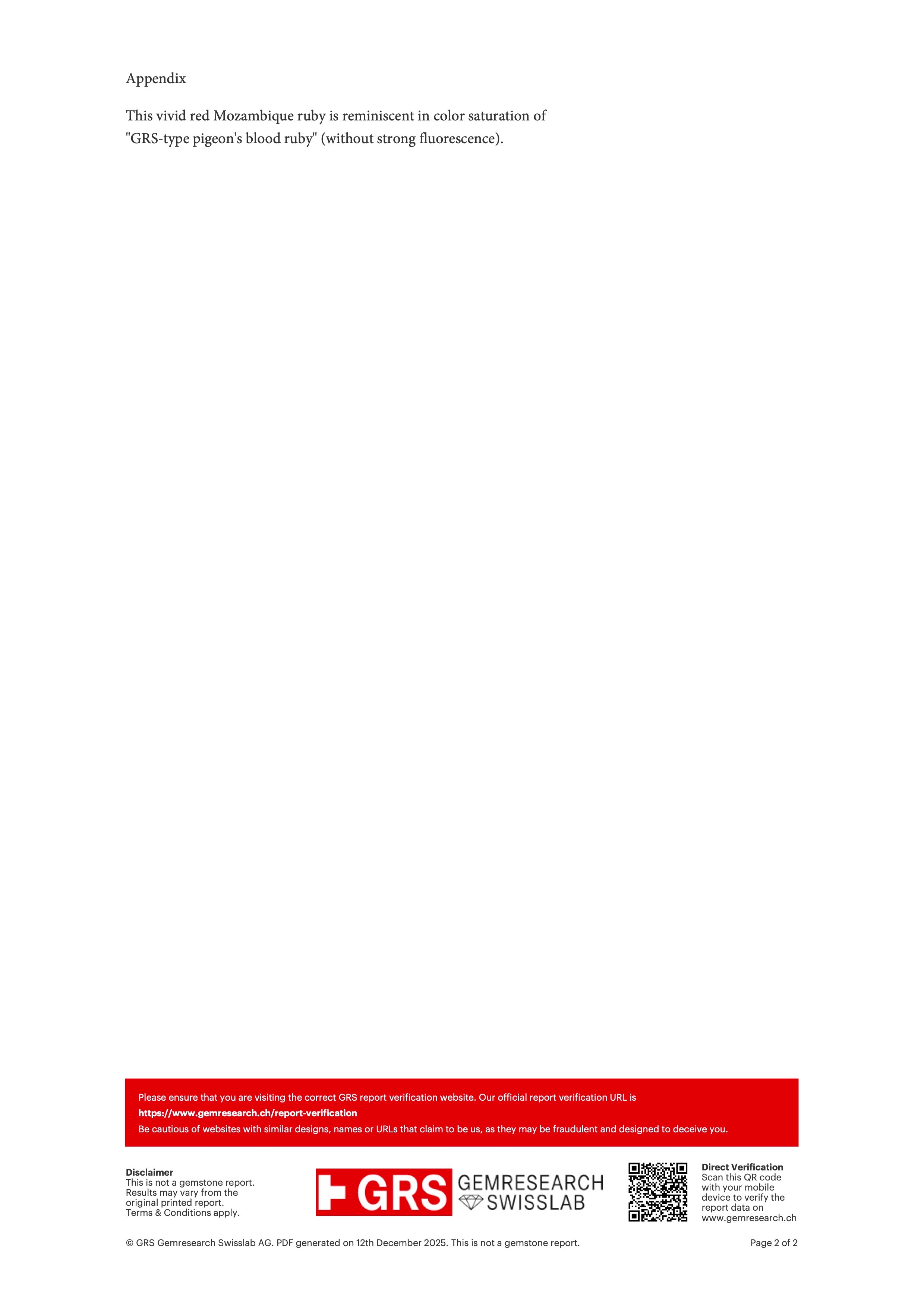 According to the GRS gemstone report, there is no indication of thermal treatment, confirming the ruby is unheated—an increasingly rare and highly desirable characteristic in the market. An appendix note further describes the color as reminiscent of “GRS-type pigeon’s blood ruby” (without strong fluorescence), highlighting its exceptional saturation and trade-recognized appeal.